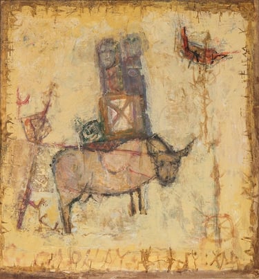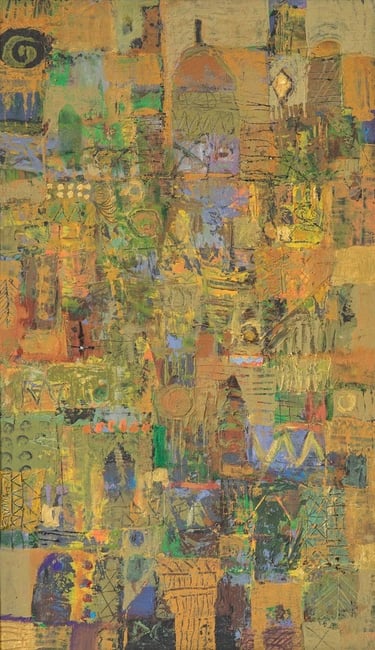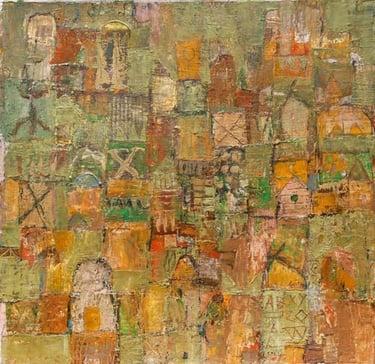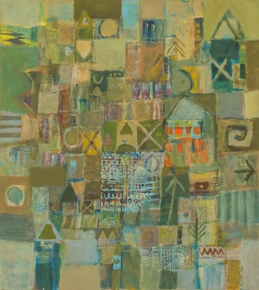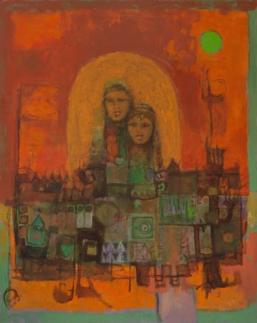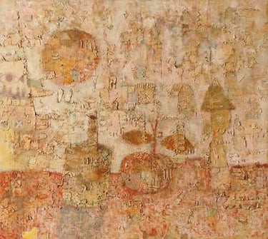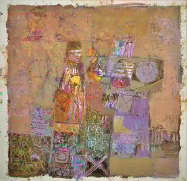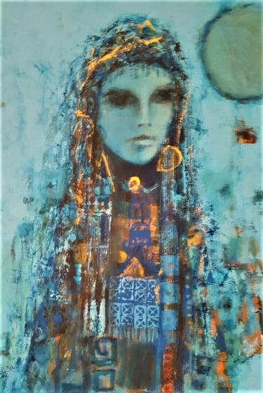 His semi-abstract style made of symbols and lively mysterious line patterns invites to imagination, with the help of the artist who deliberately points to the ends of the chain to help the visitor get through the labyrinths. ‘In fact, I make sure to give clues to help penetrate my artworks’, he once said. His feminine figures decked with gold are intriguing, while his sober compositions harmoniously favor shades of blue, tan and ocher. Most of his pieces are centered on three themes: women source of beauty and elegance, trees as symbols of life and cities referring to existence.